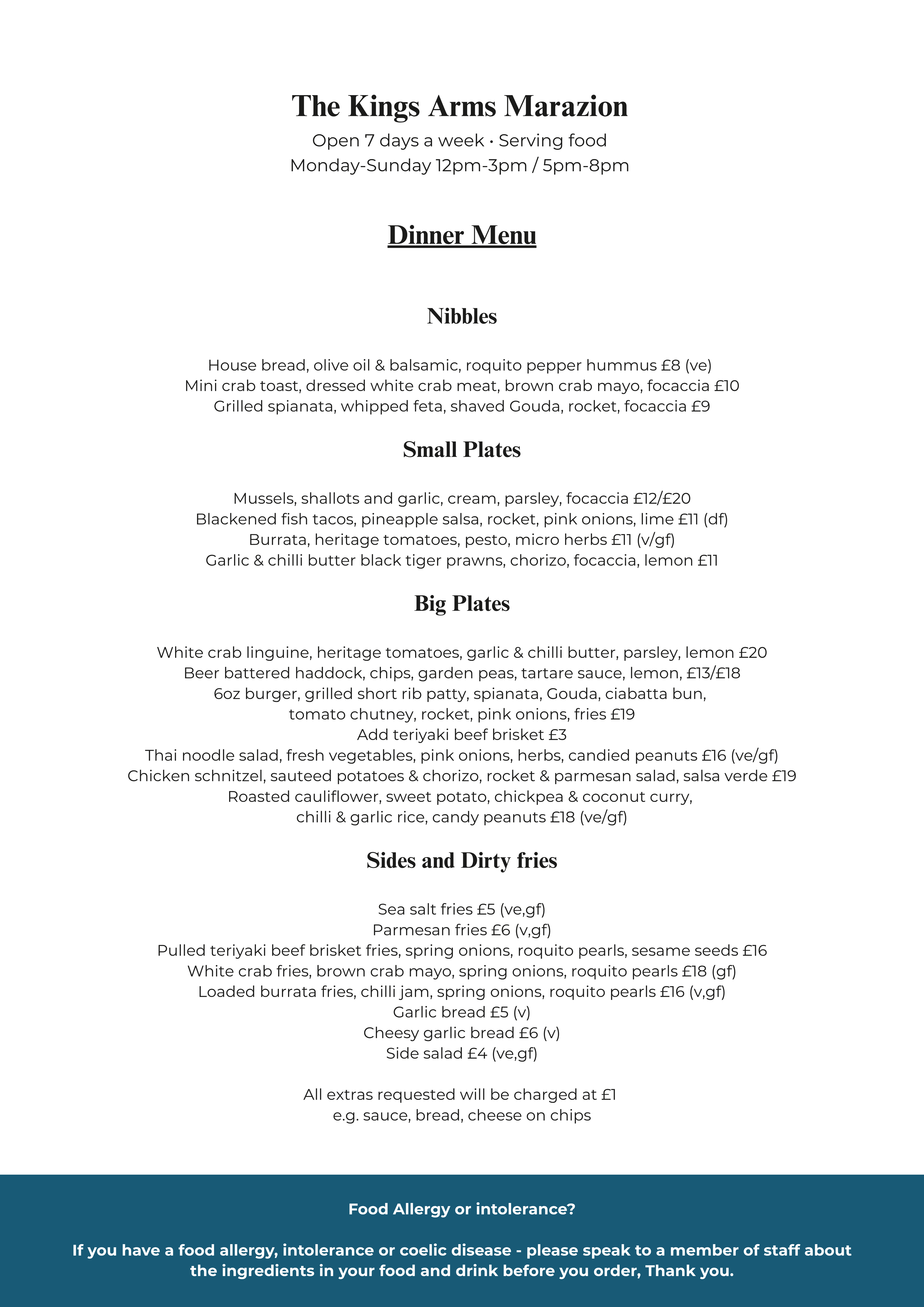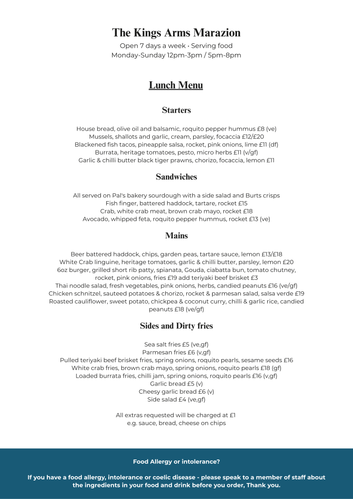 At The Kings Arms in Marazion, our Head Chef has put together a menu focused on fresh, locally sourced ingredients and simple, flavourful cooking. Everything is made in-house and served in a relaxed, friendly setting.